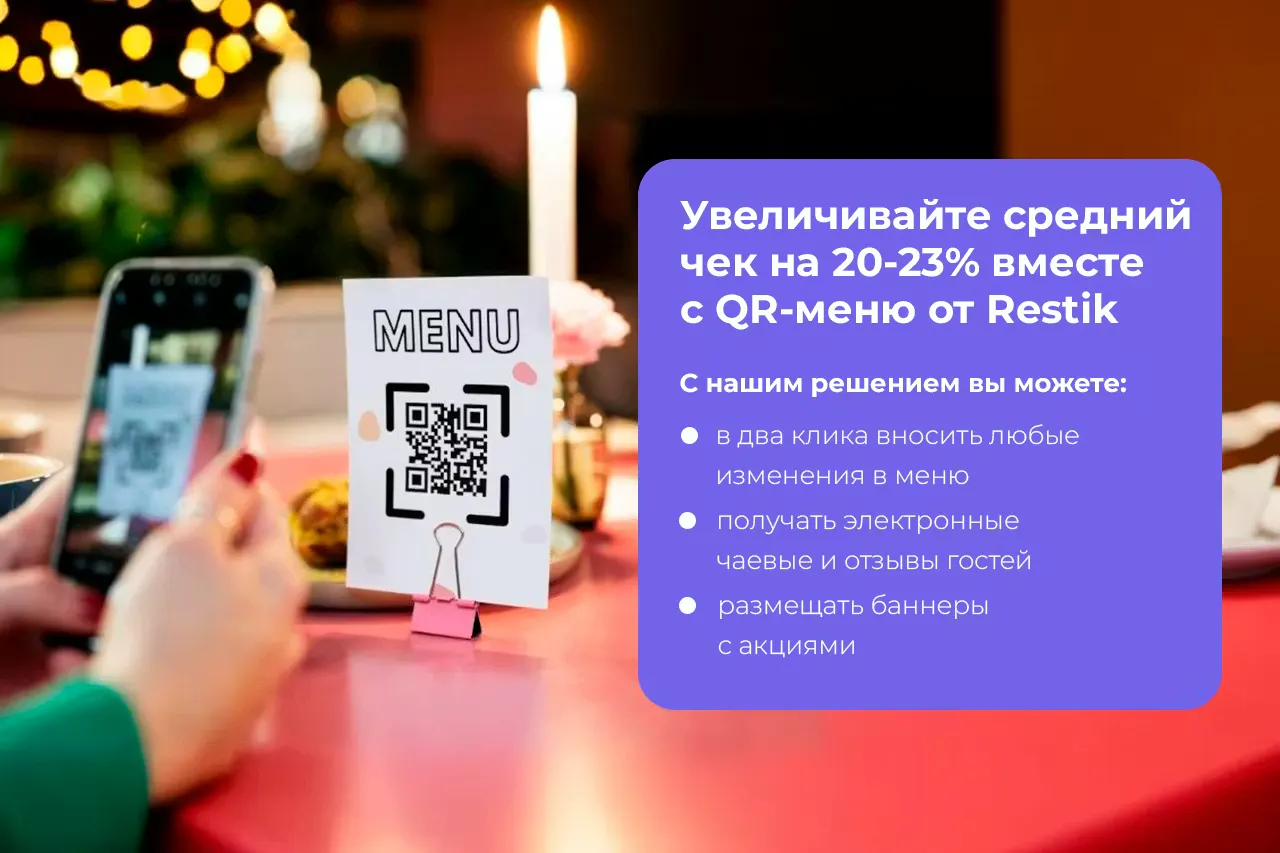 QR-меню — это точка контакта с гостем. Добавьте адрес, телефон и ссылку на карты: часть гостей открывает меню ещё до визита, чтобы решить, стоит ли идти. В Restik это можно осуществить с помощью баннеров.