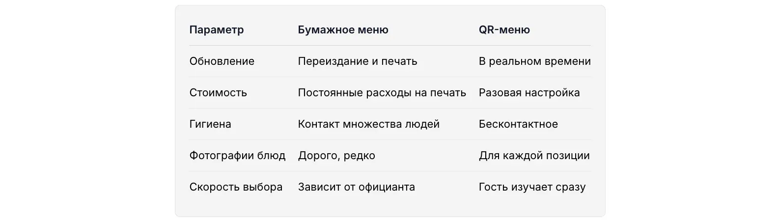 Бумажное меню передаётся от гостя к гостю весь день. QR-меню бесконтактное: каждый гость открывает его на своём смартфоне. Это особенно важно для заведений с высоким потоком посетителей.