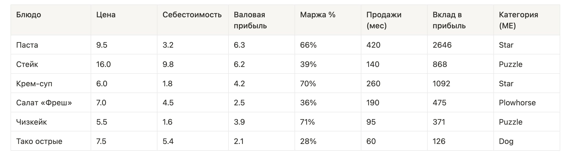 - Сравниваем каждую позицию: выше/ниже средних → определяем категорию по Menu Engineering.