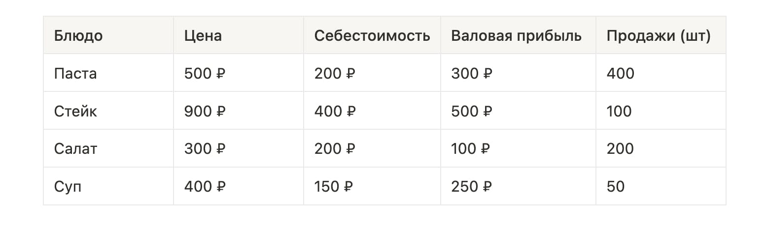 - Салат: 200 продаж × 100 ₽ маржи = 20 000 ₽ → популярный, но мало прибыли.